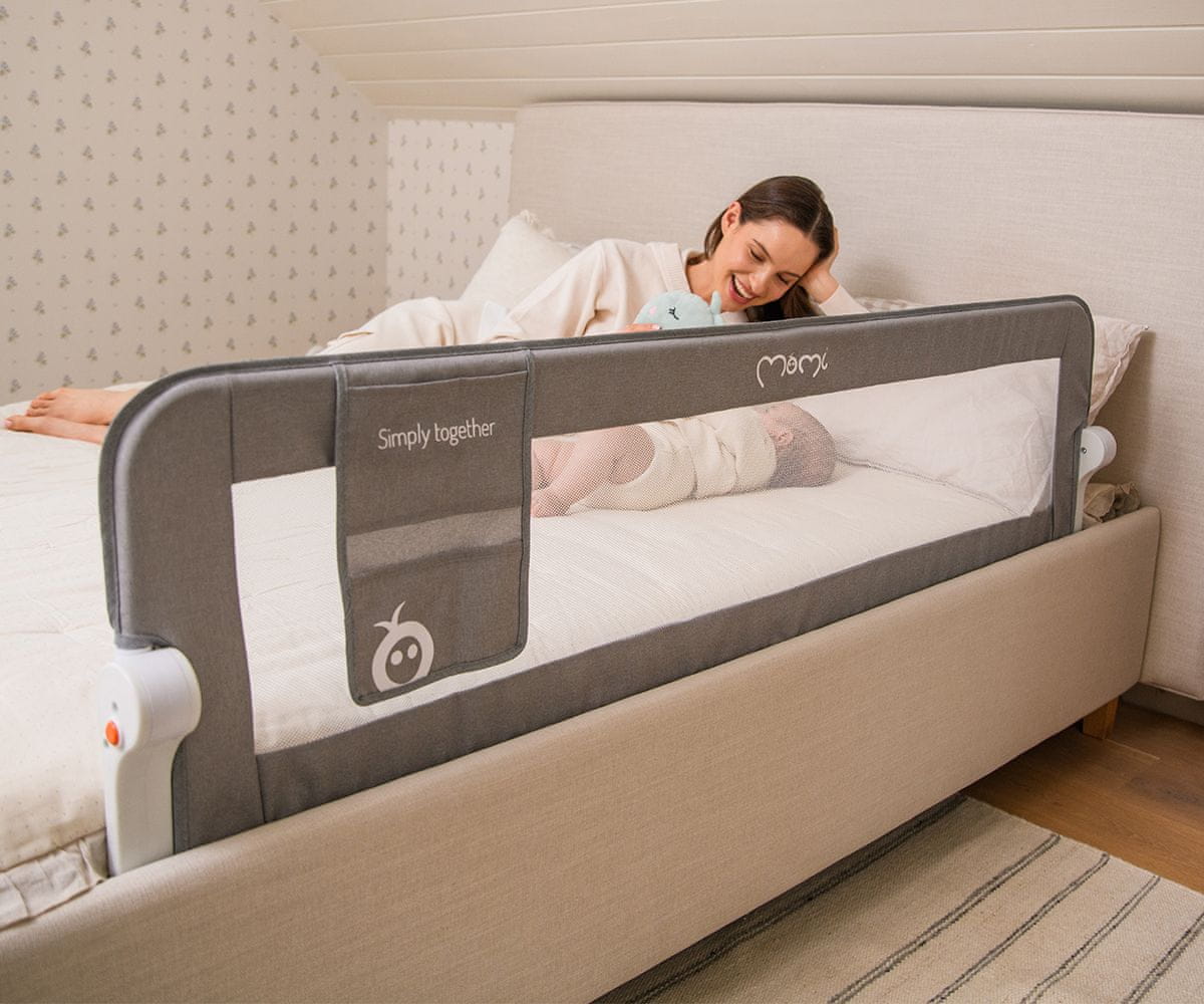 Varnostna ograja za posteljo MoMi LEXI PLUS ponuja praktično in varno rešitev, ki preprečuje, da bi se vaš otrok med spanjem skotalil ali padel iz postelje.
