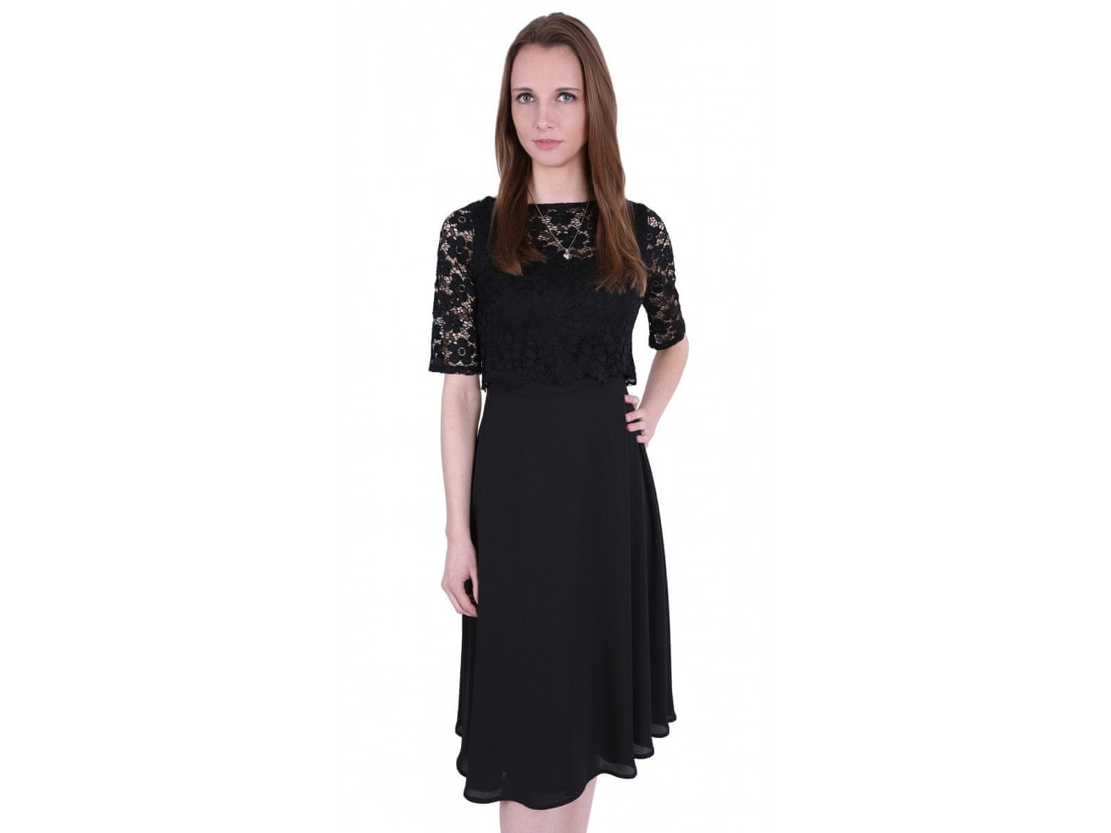 Čudovita midi obleka v črni barvi, okrašena zgoraj s čipko v klasičnem, a hkrati zelo elegantnem stilu.