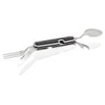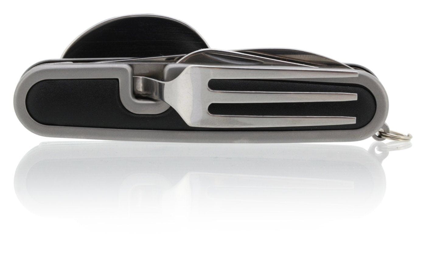 Žepni nož za kampiranje Cattara lahko uporabljate pri kampiranju, pohodništvu, na izletih v naravo in doma na vrtu. Nož je sestavljen iz skupno 5 orodij – vilice, odpirač za pločevinke in pokrovčke steklenic, žlica in rezilo noža. Razdeli se na 2 dela tako, da en del potegnete naprej. Na voljo je tudi obroček za pritrditev na obesek za ključe. Ker je zložljivi nož majhnih dimenzij, ga boste lahko pospravili v žep.