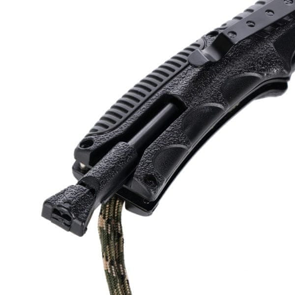 Ročaj noža je ovit s približno 50 cm paracorda, ki se lahko uporablja kot zasilna vrvica. Piščalka in kremen, ki se nahajata v ročaju, povečujeta funkcionalnost noža, zaradi česar ni le orodje za rezanje, temveč tudi orodje za preživetje. Praktična sponka omogoča pritrditev noža na rob žepa, pasu ali opreme za hiter dostop in varno prenašanje.
