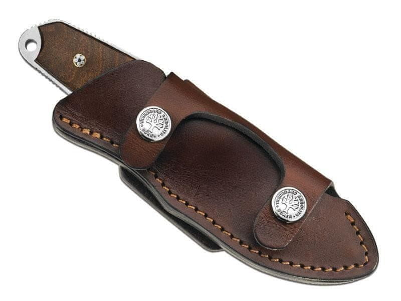 Pravi junak se ne boji nobene naloge! Masivno 4 mm debelo rezilo iz jekla N695. Nazobčane klančine dopolnjujejo ogromen ročaj iz eksotičnega gvajaškega lesa za varen oprijem. Okrasne igle za mozaik pritrdijo ročaj. Skupaj tvorita nepremagljiv par za težke naloge. Priložena je visokokakovostna usnjena torbica.