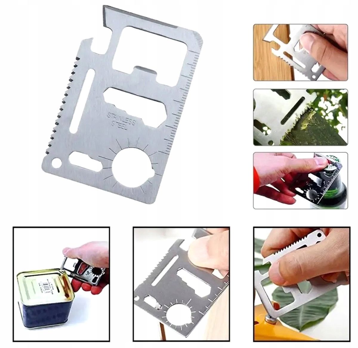 1. Kartica za preživetje (zelo trpežna zaradi uporabe nerjavečega jekla 55 HRC). Vključuje orodja, kot so: odpirač za konzerve, rezilo (nož), izvijač, ravnilo, odpirač za steklenice, ključ za vijake 6 mm, 7 mm, 8 mm in 10 mm, ključ za metuljaste vijake, žaga, kotomer, ključ za manjše vijake 4 mm in 5 mm, luknja za pritrditev vrvice ali obeska za ključe + držalo za kartico