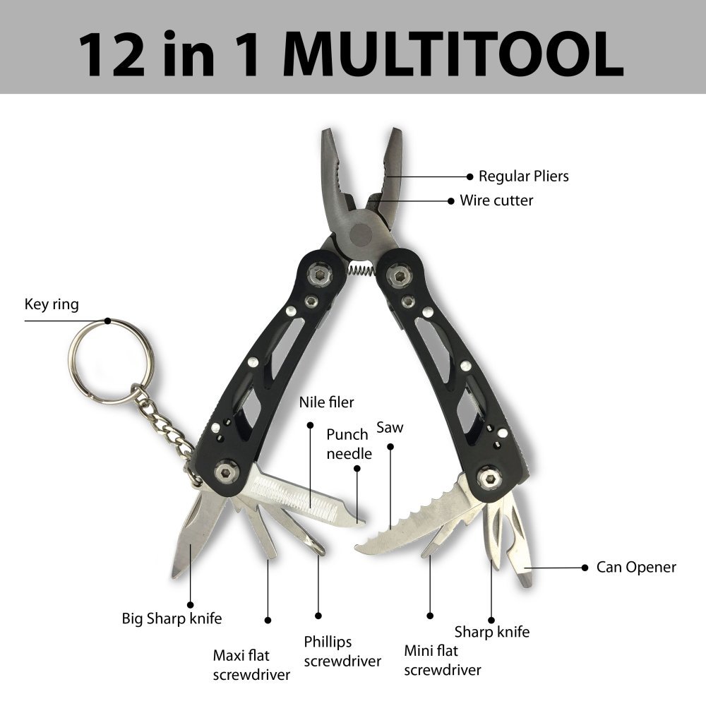 Vključuje 12 funkcij: nož, klešče, žago, rezalnik kablov, ploščati in križni izvijač, odpirač za steklenice in pločevinke, pilico, obesek za ključe, šilo in drugo.