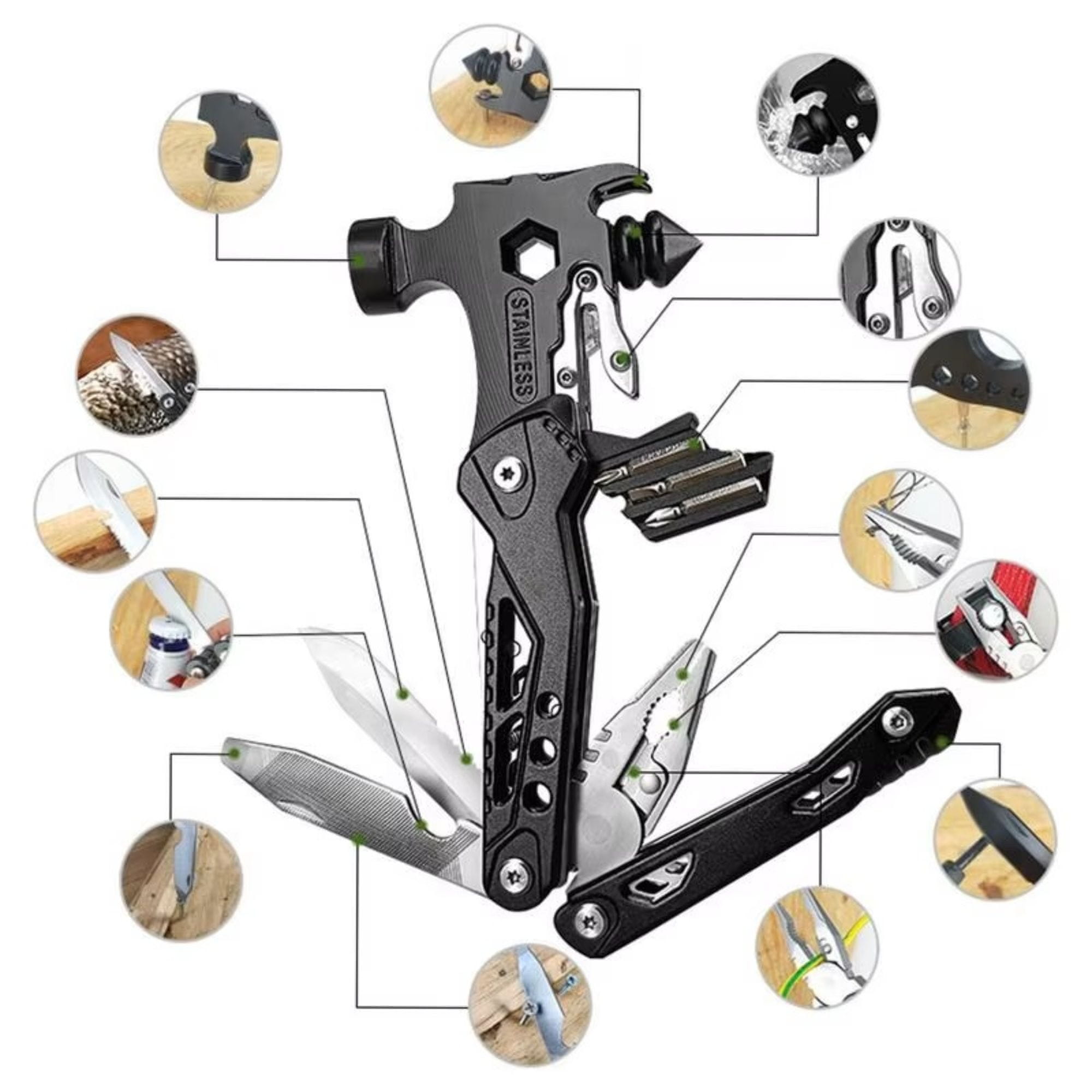 Lastnosti: Večnamenske klešče, kladivo, nož, ščipalke za žico, izvijač, odpirač za steklenice, žaga in več
