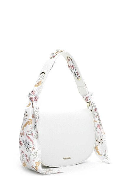 Ženska bela torbica okrašena s trakom. Z magnetno loputo. Celoten opis