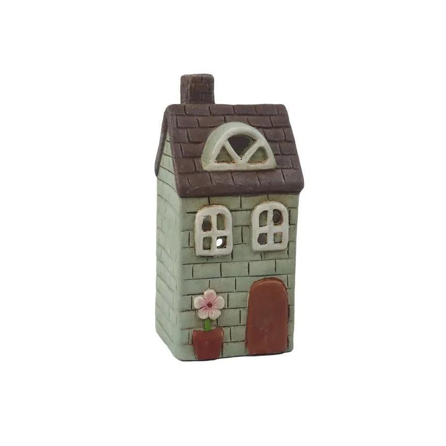 Dimenzija: 7,5 × 7 × 16 cm. Svečnik v obliki hišice z nežnim cvetličnim detajlom ustvarja prijetno, domačno vzdušje. Primeren je za čajno svečko in je čudovit dodatek za pomladno, velikonočno ali celoletno dekoracijo. Lepo se poda kot namizni okras, dekoracija police ali ljubka darilna ideja. Celoten opis