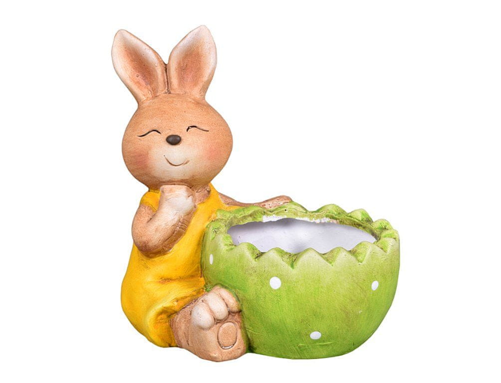 Dekoracija v obliki velikonočnega zajčka s školjko. Primeren za uporabo v zaprtih prostorih in na prostem. Primerna sezona: pomlad, velika noč. Material: terakota. Dimenzije: širina: 12 cm, globina: 10 cm, višina: 13 cm. Barva: mešanica barv, zelena lupina.