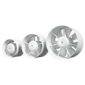 Kanalski aksialni ventilator za dovod ali odvod zraka D100 za stalno ali občasno izpušno prezračevanje kopalnic, kuhinj in drugih prostorov.