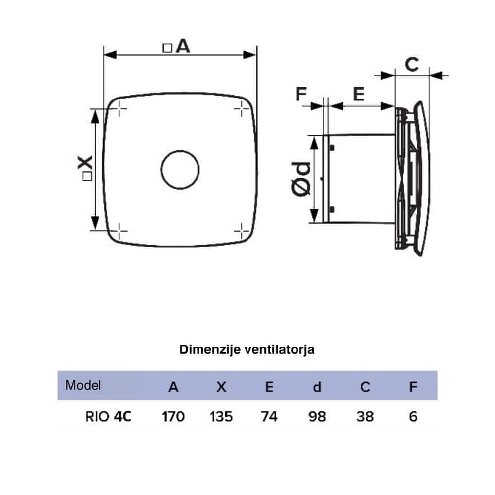 RIO 4C je visoko učinkovit in izjemno tih aksialni ventilator za kopalnico, ki je zasnovan za optimalno prezračevanje kopalnic, kuhinj, shramb in drugih manjših prostorov. S pretokom zraka 100 m³/h, nizko porabo energije 14 W in glasnostjo samo 32 dB(A) zagotavlja učinkovito odstranjevanje vlage, neprijetnih vonjav in preprečevanje plesni.