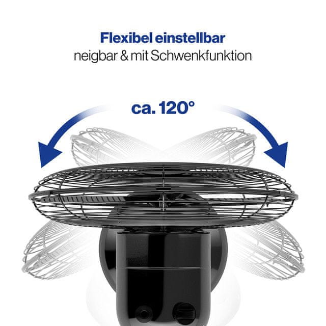 Mat črn kovinski ventilator je izdelan iz visokokakovostnega kovinskega ohišja. Ima funkcijo nihanja, ki jo je mogoče izklopiti. Njegovo delovanje je zelo tiho, zato vas ne bo motil pri delu ali počitku. Kot nagiba je nastavljiv. Zasnova je izdelana tako, da zagotavlja visoko stabilnost. Hitrost ventilatorja lahko nastavite v treh stopnjah (izklop-1–2–3). Premer ventilatorja je 25 cm, moč pa 30 W. Napajanje je 220–240 V, 50 Hz.