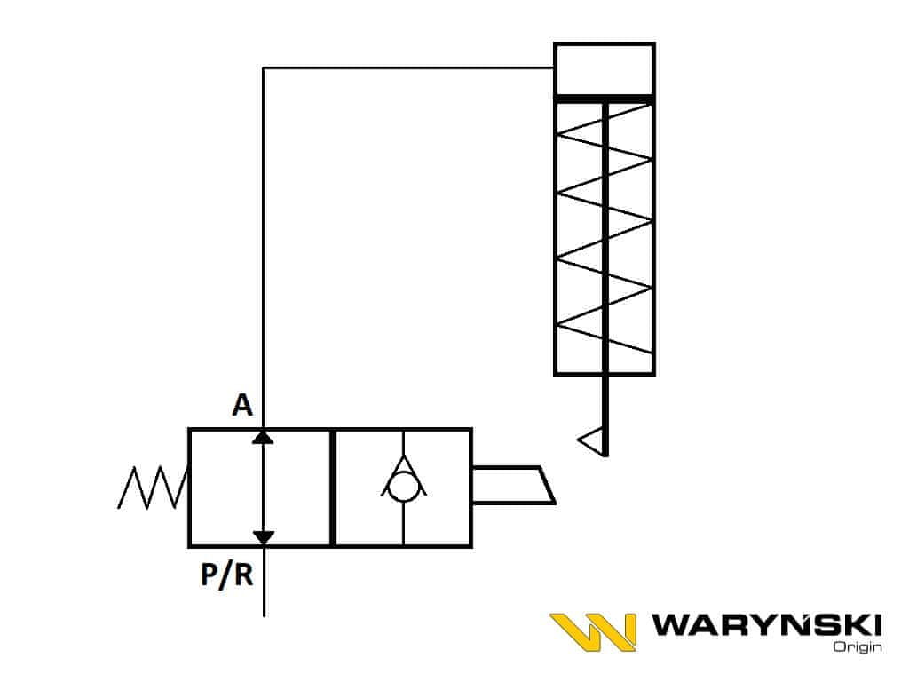 Waryński 2/2" M18×1,5 12L protipovratni ventil (omejevalnik podajanja/hoda) z montažnimi luknjami, 350 barov. Ta vrsta ventila je zasnovana za samoomejevanje giba enosmernih (1-smernih) valjev. V začetnem položaju je ventil odprt. Aktivira se kabel, pritrjen na drog cilindra (batnico) in ročaj v napetem položaju omejevalnik prekine (zaustavi) pretok hidravličnega olja (z njim omeji hod cilindra).