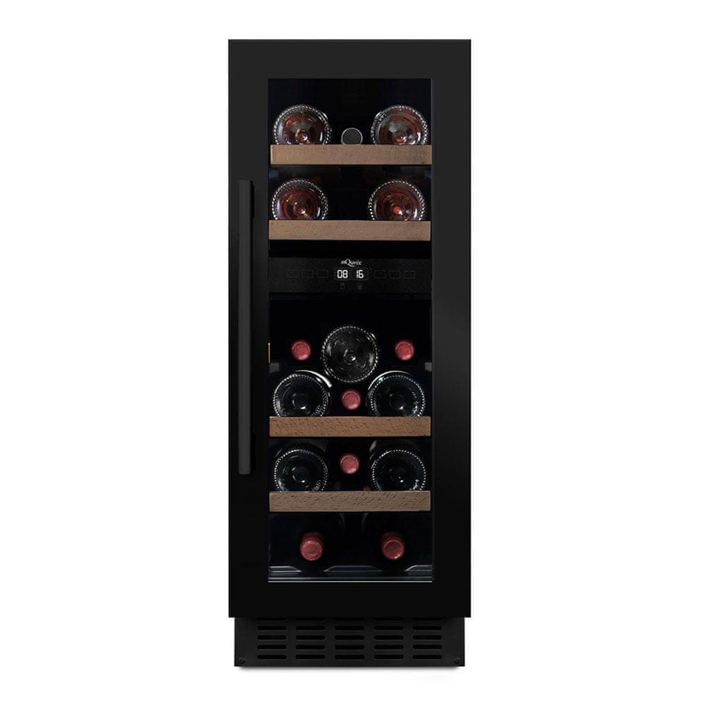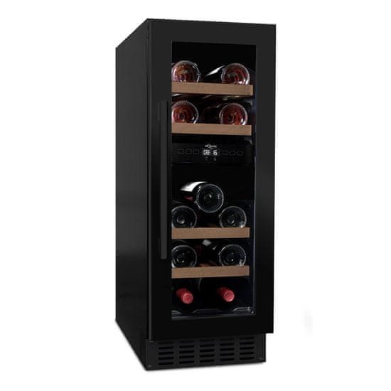 Vinska vitrina za 16 steklenic z črnim okvirjem vrat in dvema področjema hlajenja.