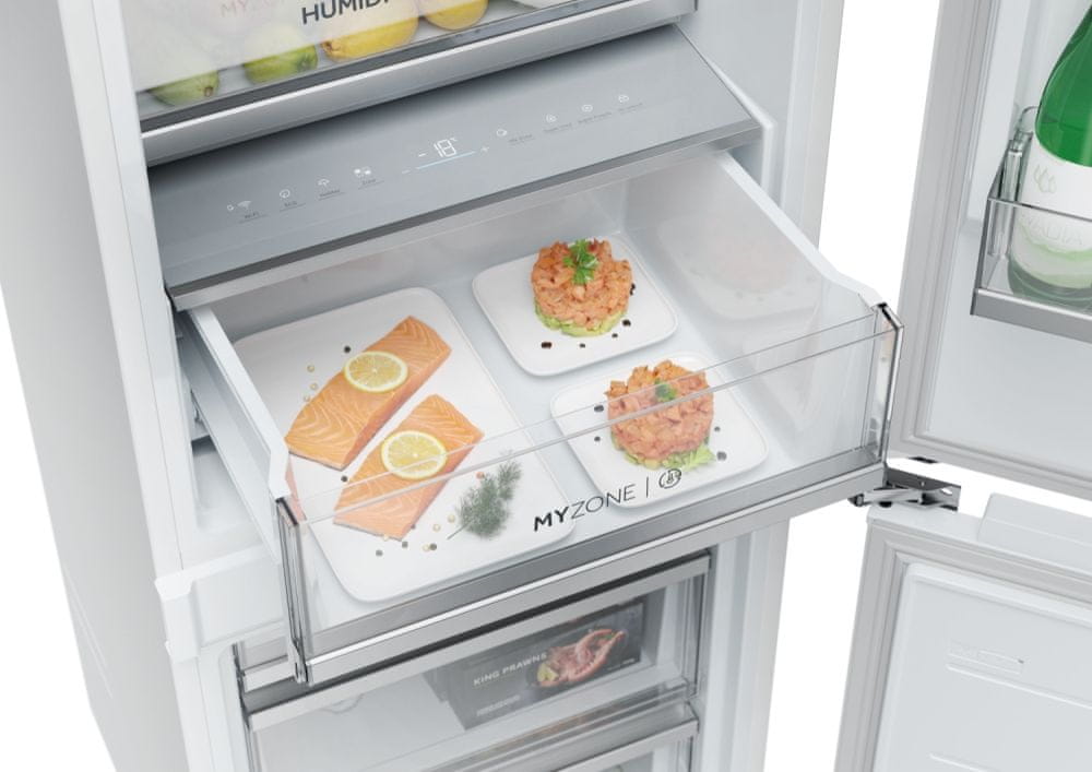 My Zone in Humidity Zone predala ponujata popolno rešitev za ohranjanje kakovosti in svežine živil. V predalu My Zone lahko hitro in preprosto prilagodite temperaturo svojim trenutnim potrebam. Predal Humidity Zone pa ohranja svežino vašega sadja in zelenjave do dvakrat dlje, saj je opremljen s tehnologijo HCS (Humidity Control System – sistem za nadzor vlage) – membrana iz rastlinskih vlaken, ki lahko vzdržuje 90-odstotno vlago in samodejno uravnava pravilno vlažnost.
