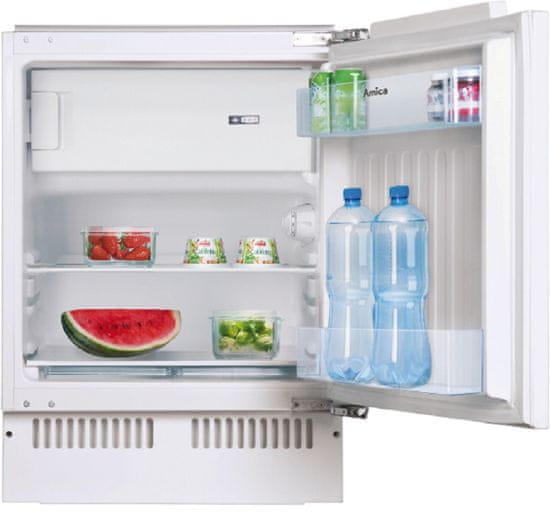 Vgradni hladilnik z zamrzovalnikom Amica UKS 16148 s prostornino 111 litrov. V notranjosti sta 2 polici in 2 polici v vratih. Notranjost je osvetljena z varčno LED osvetlitvijo. Celoten opis