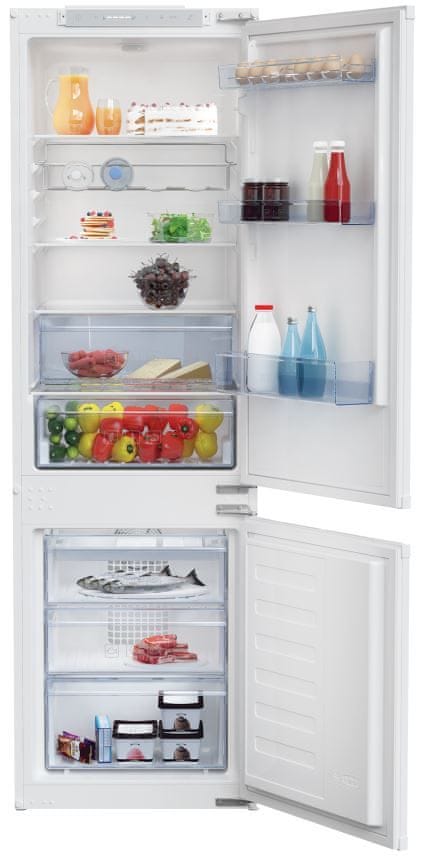 Prilagodljiv in prostorenBeko vgradni hladilnik BCHA275E3S je odličen hladilnik, opremljen s štirimi prilagodljivimi steklenimi policami in posebnim izvlečnim predalom za sadje in zelenjavo. Vaša živila bodo tako vedno skrbno shranjena in sveža. Vrata hladilnika imajo protibakterijska tesnila, ki zagotavljajo večjo higieno, saj preprečujejo razvoj bakterij in plesni. Ima tudi možnost zamenjave strani odpiranja vrat, tako da boste lahko hladilnik prilagodili kakor vam najbolj ustreza. Za osvetlitev notranjosti hladilnika bodo poskrbele LED-verige na stranskih stenah hladilnika. |