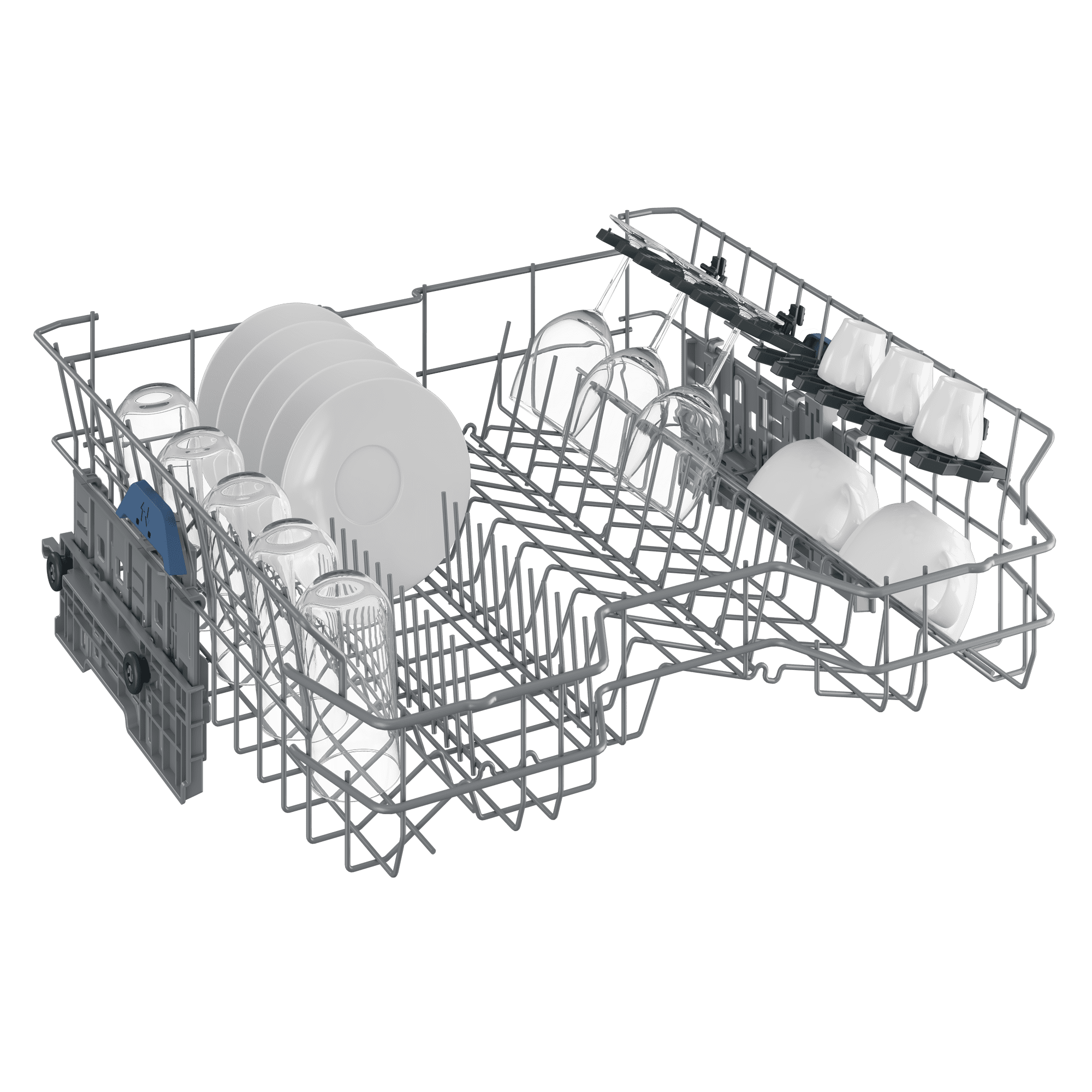 Popolnoma vgradni pomivalni stroj ponuja veliko prostora za 15 pogrinjkov, kar je idealno za večje družine. Notranjost je izjemno prilagodljiva zahvaljujoč podstavkom za krožnike Easy-Fold, ki omogočajo enostavno zlaganje večjih loncev in ponev. Zgornja košara je nastavljiva po višini v treh nivojih, tudi ko je polna.
