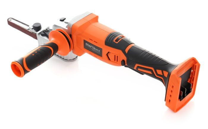 TRAČNI BRUSILNIK Kraft & Dele KD1774 iz serije PROSERIES, z 18V motorjem, polnjenim z univerzalno baterijo PROSERIES, namenjen za brušenje, grobo in poliranje kovin, kamna in keramike.