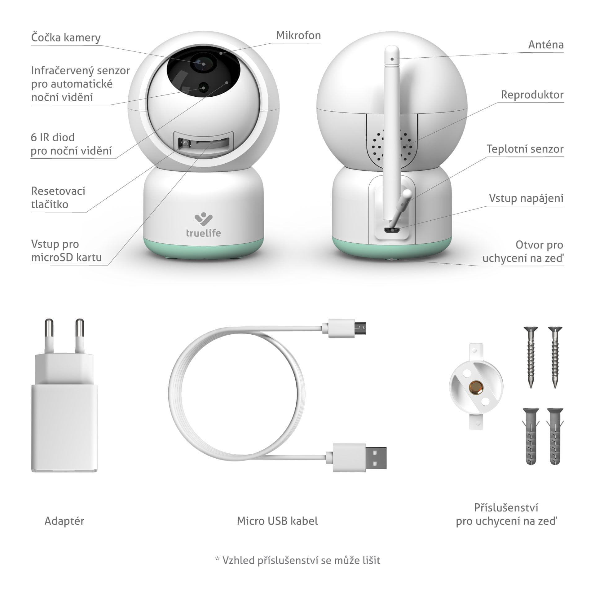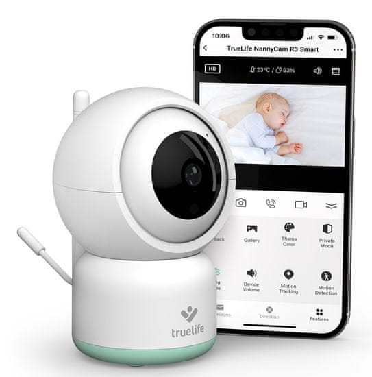 Rotacijska elektronska varuška TrueLife NannyCam R3 Smart lahko spremlja gibanje in se obrača za njim. Obenem njena širokokotna leča vidi v vse kotičke in v mraku samodejno aktivira nočno gledanje. Doseg elektronske varuške je zahvaljujoč povezavi z internetom neomejen in v trenutku, ko imate zaslon telefona izklopljen, sama zagotovo ne spi. Posname vsak gib in zvok ter vam pošlje obvestilo na vaš telefon. Posnetek lahko v načinu 24/7 nalaga tudi na kartico SD.