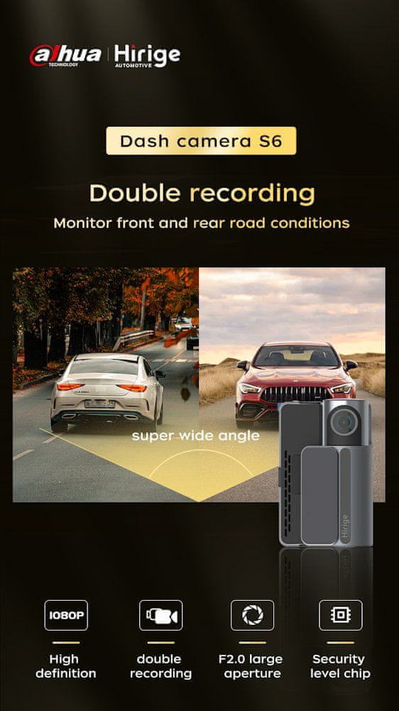 Druga prednost je zaslon na dotik, ki omogoča enostavno uporabo in je vedno pri roki. Dahua S6 ima vgrajen modul Wi-Fi, ki omogoča enostavno povezovanje in deljenje. Seveda je vgrajen tudi G-senzor, ki samodejno zaklene trenutno posnete posnetke v primeru zaznave udarcev ali močnih tresljajev. Praktična zasnova omogoča tudi uporabo dodatne zadnje kamere, ki omogoča popoln pregled nad dogajanjem pred in za vozilom.