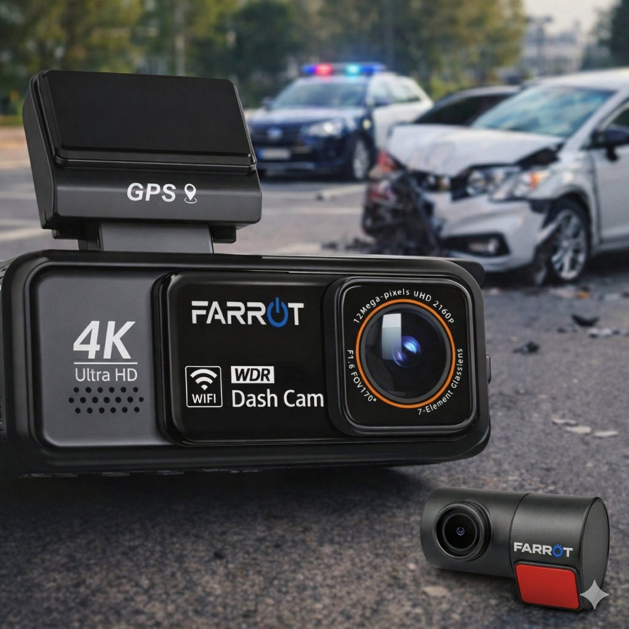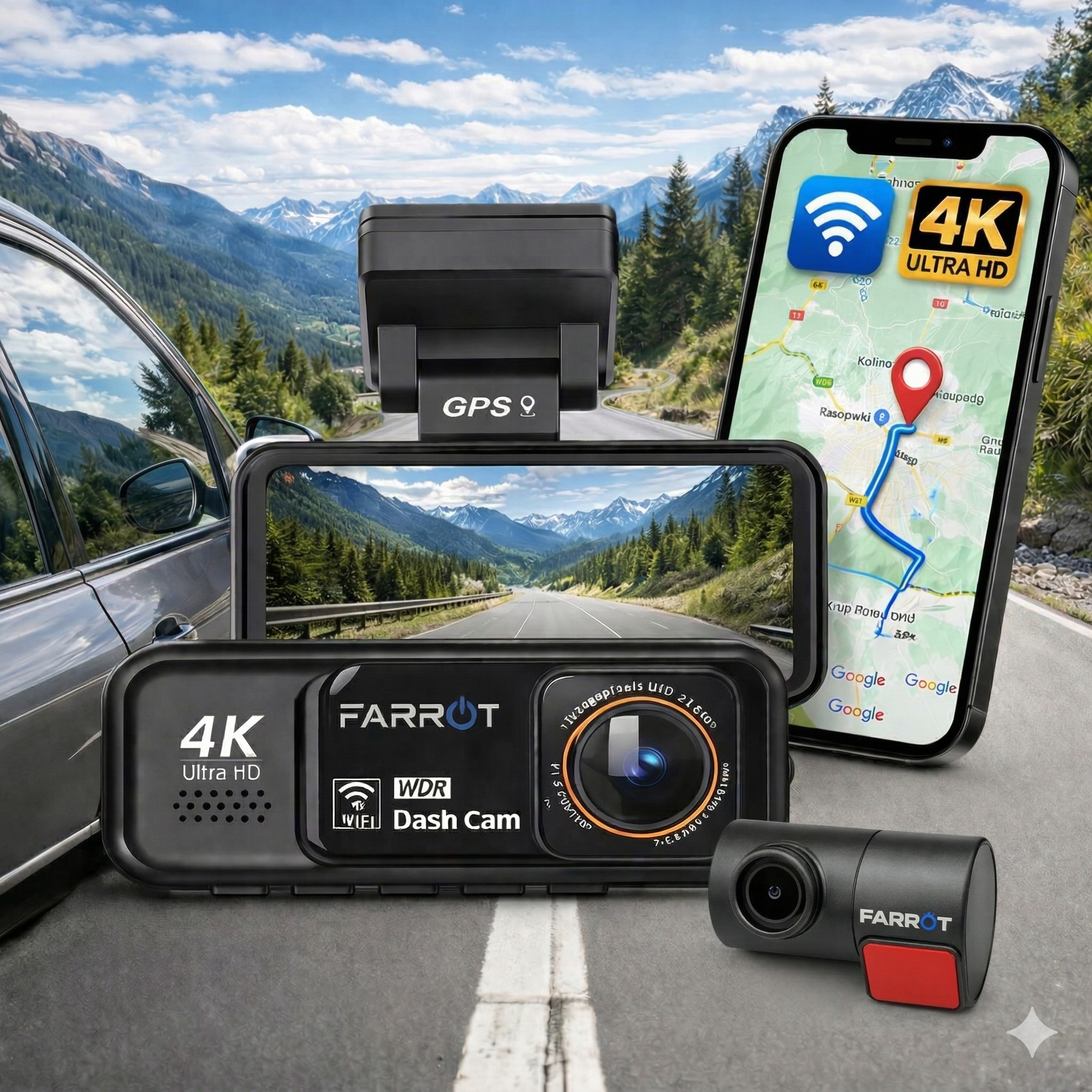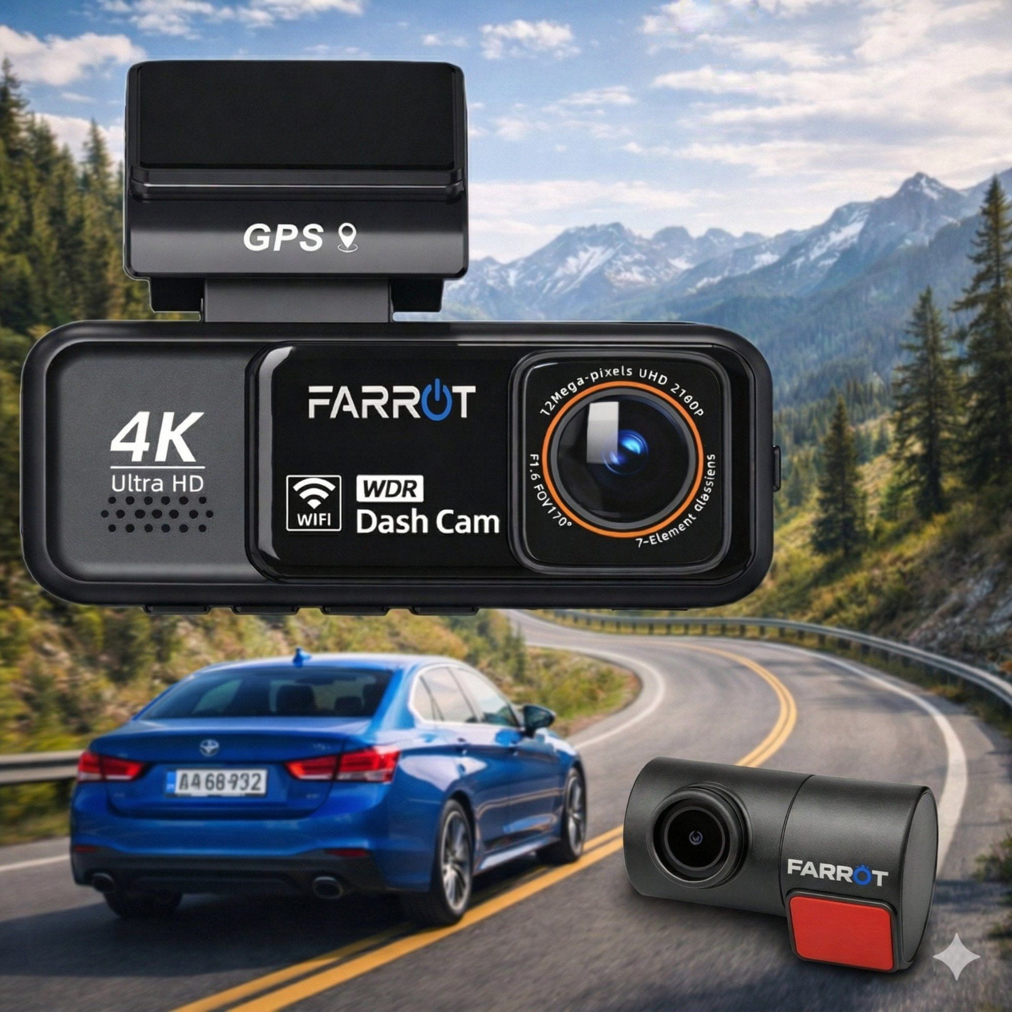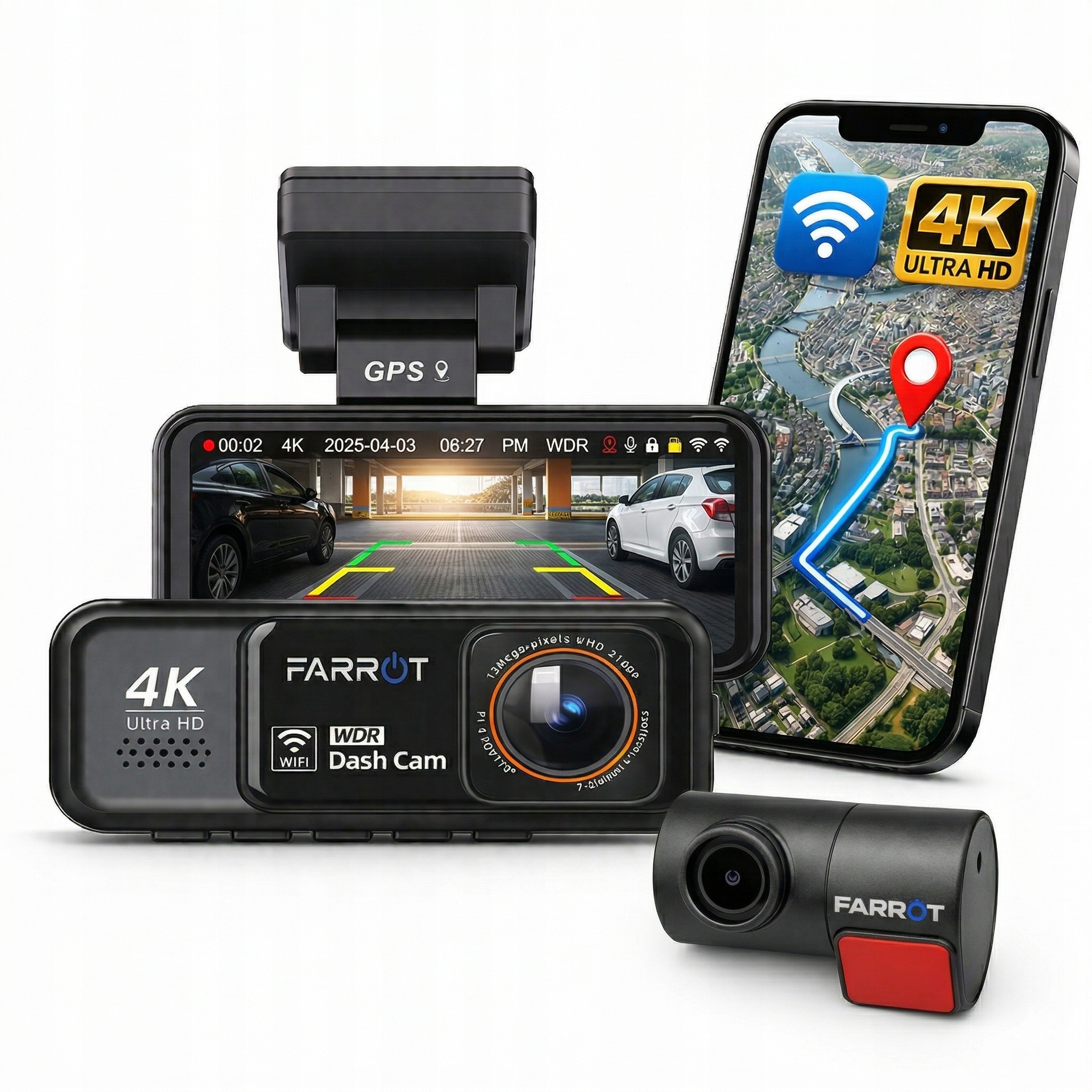 Farrot Avto kamera 4K UHD z Wi-Fi, GPS, HDR, ADAS nočnim načinom, funkcijo parkiranja in mobilno aplikacijo, zadnja kamera