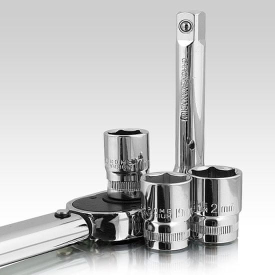 DVOSMERNI MOMENTNI KLJUČ   Momentni ključ je natančno orodje za merjenje navora. Uporablja se za zvijanje navojnih sponk, tako da je vezni moment poznan in primeren vrsti materiala in trdnosti vijaka in matice Ključ je sestavljen iz glave s kvadratnim steblom in kraka za prenos sile. Glava se uporablja za pritrditev šesterokotnih vtičnic.Uporablja se predvsem v avtomobilski tehniki za natančno pritrjevanje in povsod tam, kjer je proizvajalec določil potreben zatezni moment konektorja.   Delovanje tipk Izberite ustrezno lestvico in odklenite gumb, vrednost 0 na lestvici mora sovpadati z navpično črto roke. Gumb je treba obrniti v smeri urinega kazalca do želenega navora, lestvica na gumbu sovpada z navpično črto kraka ključa. Nato zaklenite gumb in izberite smer vrtenja raglje, nato pa lahko namestite ustrezno vtičnico. Pri zategovanju boste zaslišali „klik“, nato prenehajte z zategovanjem.     Lastnosti izdelka: dvosmerni dodatni, visokokakovosten nasadni ključ, razpon moči do 210 Nm, gladka nastavitev, enostavna uporaba, pregledna lestvica, univerzalna Tehnični podatki: Dolžina: 46 cm Velikost: 1/2" Navor: 28–210 Nm Teža: 2,1 kg Material: Krom-vanadijevo jeklo Vrtenje: desno / levo    V kompletu: ✓ 1 x momentni ključ  ✓ 3 x vtičnice (17, 19, 21) ✓ 1 x podaljšek 1/2" 125 mm