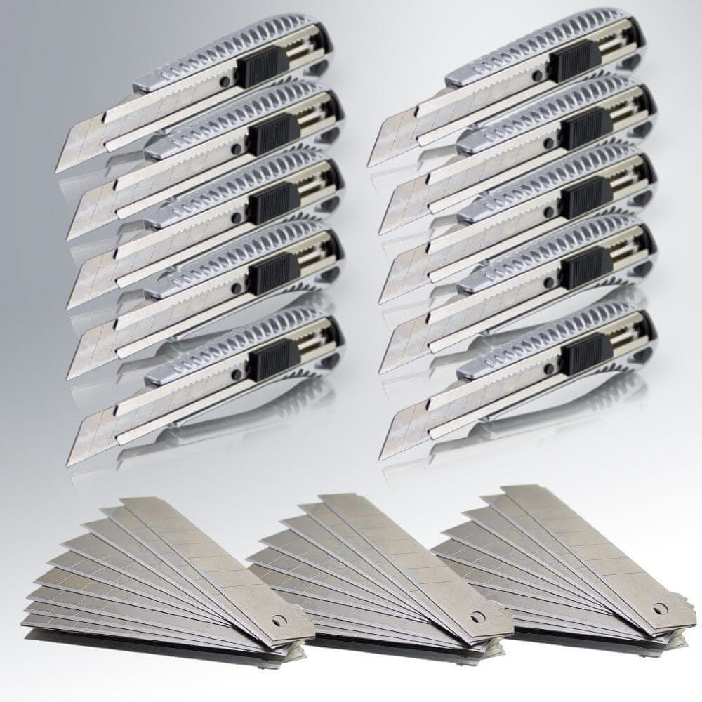 10× NOŽ ZA REZANJE ALUMINIJA Z REZILI Režite kot profesionalci – ta nož se zaradi svoje klasične oblike popolnoma prilega vaši roki. Ne glede na to, ali gre za pakiranje, polaganje preprog ali druge aplikacije – to vsestransko orodje je popolno.   Lastnosti izdelka: klasična oblika rezila iz trpežnih materialov, vključena v komplet   Tehnični podatki: Material rezila: jeklo Material ročaja: aluminij, plastika Število delov: 13 Širina rezila: 18 mm Barva: srebrna Širina: 3 cm Dolžina: 15 cm Teža z rezilom: 92 g Rezila: 18 mm Rob: posnet Debelina rezila: 0,5 mm ; Set vsebuje: 10× aluminijast nož in 30× rezila