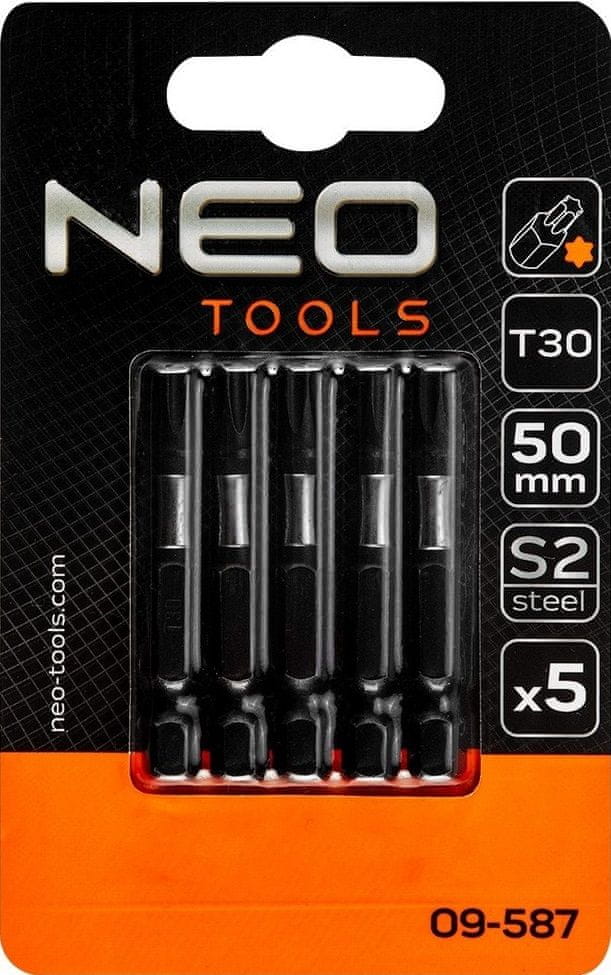 NEO udarni nastavki (ref. 09–587 ) je komplet 5 profesionalnih udarnih nastavkov tipa T30 z dolžino 50 mm. Namenjeni so za izvijače 1/4". Imajo sistem, ki preprečuje zdrs rezila z vijaka. Biti so izdelani iz jekla S2. Omogočajo doseganje visokega vrtilnega momenta 21,8 Nm. Sistem za absorpcijo navora ščiti bite pred hitro obrabo in znatno podaljša njihovo življenjsko dobo.
