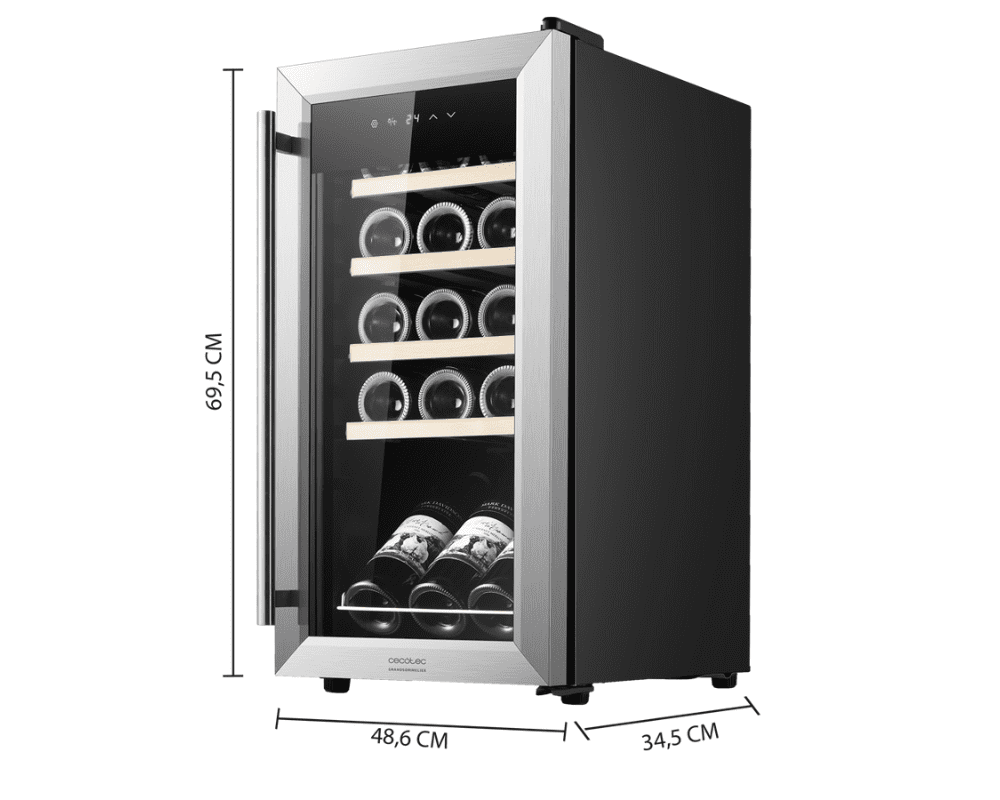 Vinska vitrina z velikim notranjim prostorom za 15 steklenic. Vgrajen ima kompresor, ki zagotavlja nizko raven hrupa in visoko zmogljivost. Je zelo tih in brez vibracij, raven hrupa samo 39 dB. Za idealno temperaturo vina poskrbi možnost nastavitve temperature od 5 do 18 ºC. Z nadzorno ploščo na dotik prilagodite temperaturo, vklopite ali izklopite luč, izberite med ºF ali ºC in jo odklenite. Vrata in ročaj so iz nerjavečega jekla.