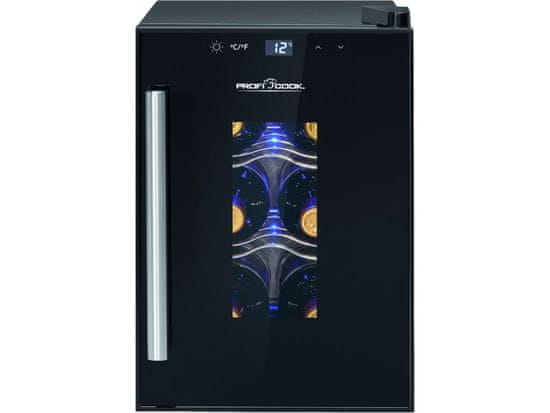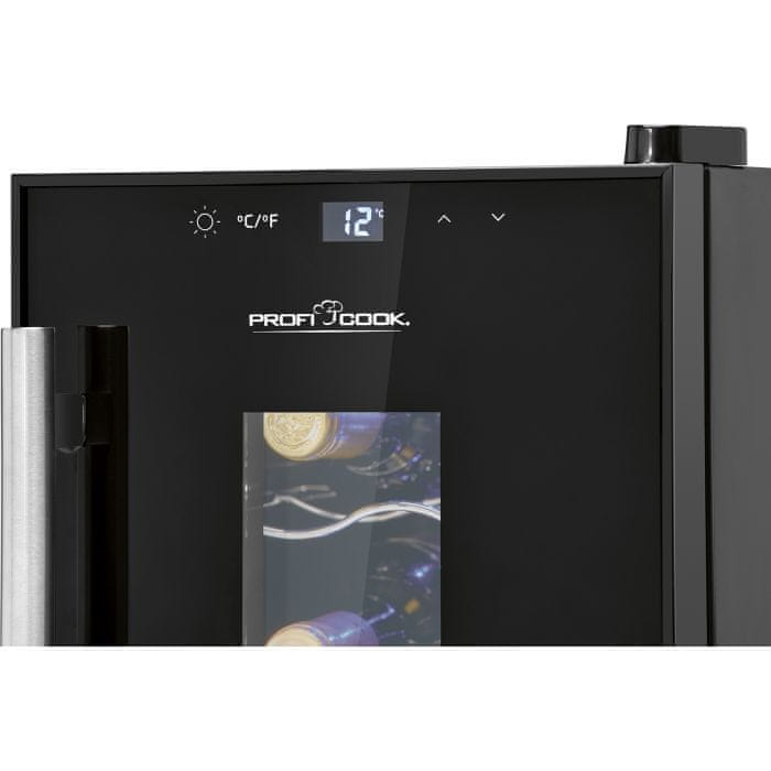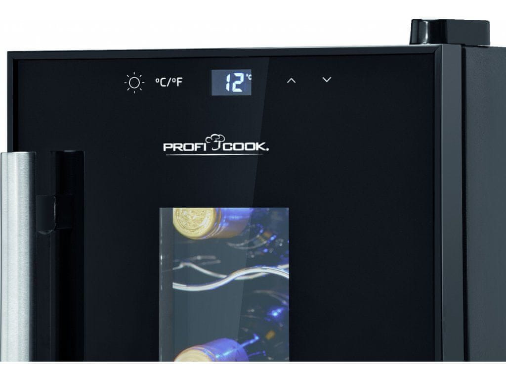 ProfiCook WK 1230 – omara za vino . Energijski razred G . Raven hrupa 26 dB . Prostornina 17 L / 6 steklenic . Razpon hlajenja od 11 do +18 °C . Modra notranja osvetlitev LED. Protivibracijski sistem. Senzorsko upravljanje na dotik. Modro osvetljen zaslon LCD. Elektronski nadzor temperature. Temperaturno območje: +11 °C do +18 °C.