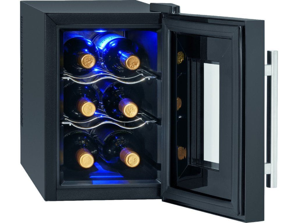 ProfiCook WK 1230 – omara za vino . Energijski razred G . Raven hrupa 26 dB . Prostornina 17 L / 6 steklenic . Razpon hlajenja od 11 do +18 °C . Modra notranja osvetlitev LED. Protivibracijski sistem. Senzorsko upravljanje na dotik. Modro osvetljen zaslon LCD. Elektronski nadzor temperature. Tempera Celoten opis