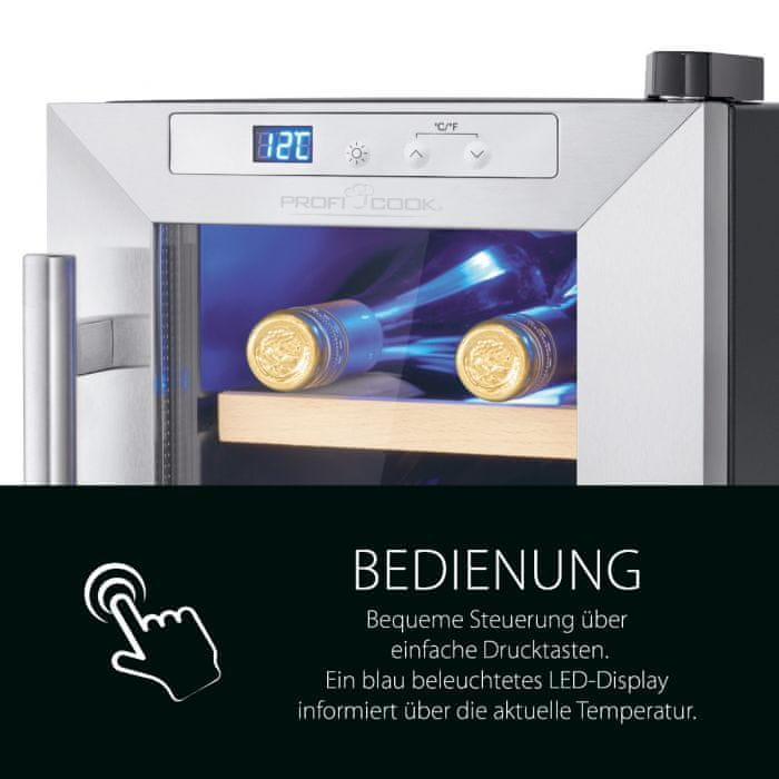 ProfiCook WK 1231 – omara za vino . Energijski razred G . Raven hrupa 26 dB . Prostornina 17 L / 6 steklenic . Razpon hlajenja od 11 do +18 °C . Modra notranja osvetlitev LED. Protivibracijski sistem. Senzorsko upravljanje na dotik. Modro osvetljen LCD-zaslon. Elektronski nadzor temperature. Tempera Celoten opis