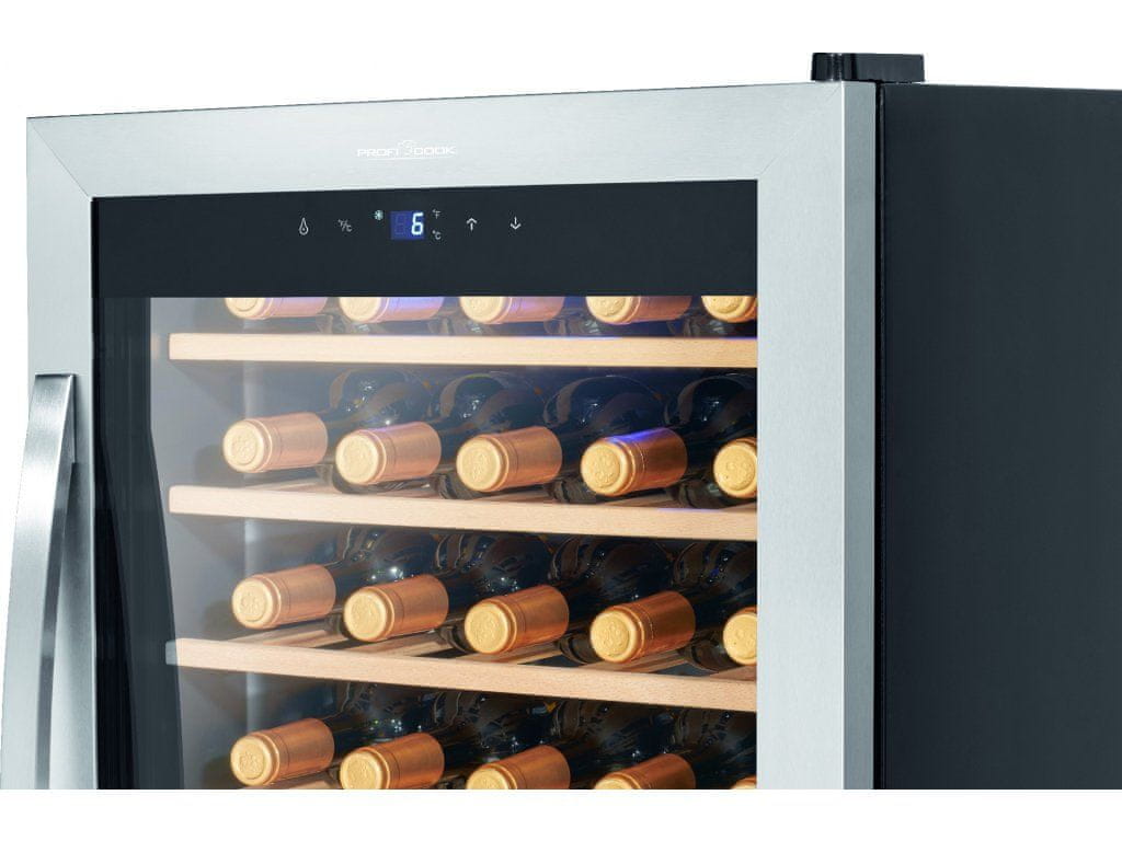 ProfiCook WK 1235 – Vinska klet . Energijski razred G . Raven hrupa 36 dB . Prostornina 95 L/ 36 steklenic . Razpon hlajenja od 4 do +18 °C Hlajenje s kompresorjem. Modra LED notranja osvetlitev. Protivibracijski sistem. Senzorsko upravljanje na dotik. Modro osvetljen zaslon LCD. Elektronski nadzor temperature.