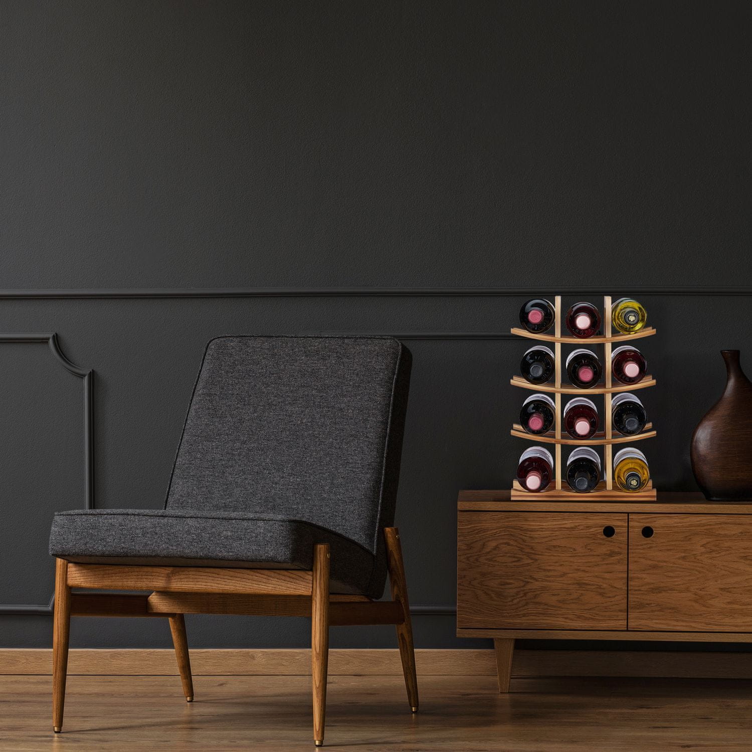 Kompaktno stojalo za vino ponuja elegantno shranjevanje za 12 steklenic, izdelano iz trpežnega bambusa za naravno estetiko. Njegova vodoodporna oblika zagotavlja vsestranskost, popolna za kuhinje in bivalne prostore.