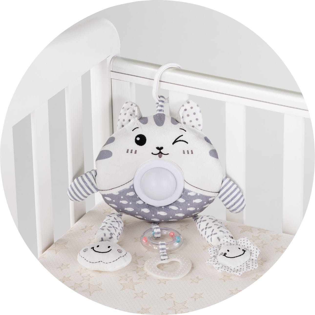15 melodij in pesmi, vgrajeni svetlobni učinki, Kompakten – primeren za voziček in otroško posteljico, preprosto upravljanje z dvema gumboma, Za delovanje sta potrebni 2 bateriji AAA (nista vključeni).