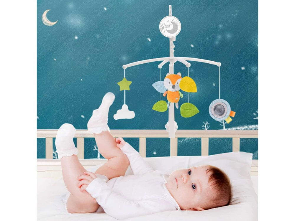 Razkošen vrtiljak z glasbeno skrinjico je ponudba za najmlajše otroke, ki je kot nalašč za pomiritev in uspavanje otroka. Vrtiljak vsebuje glasbeno skrinjico, ki oddaja prijetno mirno melodijo, in plišaste obeske različnih oblik in nežnih umirjenih barv. Struktura vrtiljaka je izdelana iz plastike.