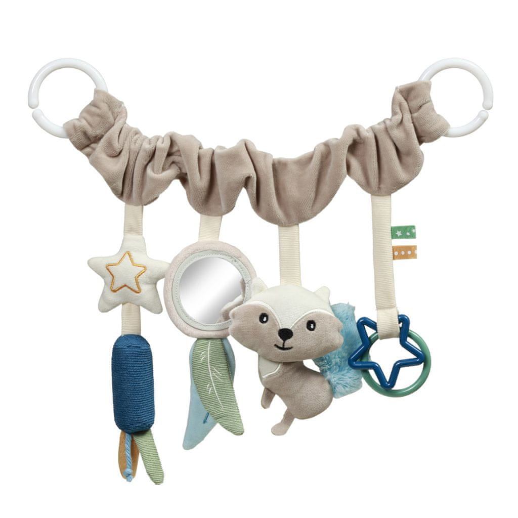 Viseči trapez za voziček in avtomobilski sedež Raccoon je senzorični izdelek, ki lahko spodbuja dotik in vid vašega otroka ter izboljšuje njegove motorične sposobnosti. Vse, kar morate storiti, je, da ga pritrdite na voziček, zibelko ali avtomobilski sedež, da se bo otrok med sprehodi in potovanji zabaval. Viseči predmet, prekrit s tkanino, prijetno na otip, je opremljen z očarljivim medvedkom čistilcem, varnim ogledalom, prijetnimi zvončki ter obročkom in zvezdico. Skrbno izbrani kosi so privlačni in bodo pritegnili otrokovo pozornost. Vaš malček se lahko igra, odkriva svet ter razvija oči in sluh.