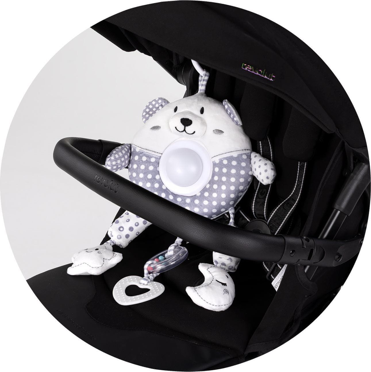 15 melodij in pesmi, vgrajeni svetlobni učinki, Kompakten – primeren za voziček in otroško posteljico, preprosto upravljanje z dvema gumboma, Za delovanje sta potrebni 2 bateriji AAA (nista vključeni).