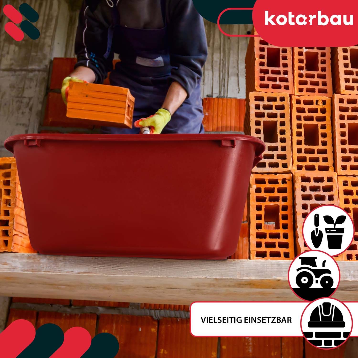 Gradbeni zabojnik KOTARBAU® je izjemno praktičen zabojnik, ki ga je mogoče uporabiti za najrazličnejše obnovitvene in vrtnarske projekte. Zasnovan je za pripravo zidarske malte, lepil za ploščice in mavčnih ometov, ima visoke stranske stene za lažjo uporabo in zmanjšuje tveganje brizganja materiala.