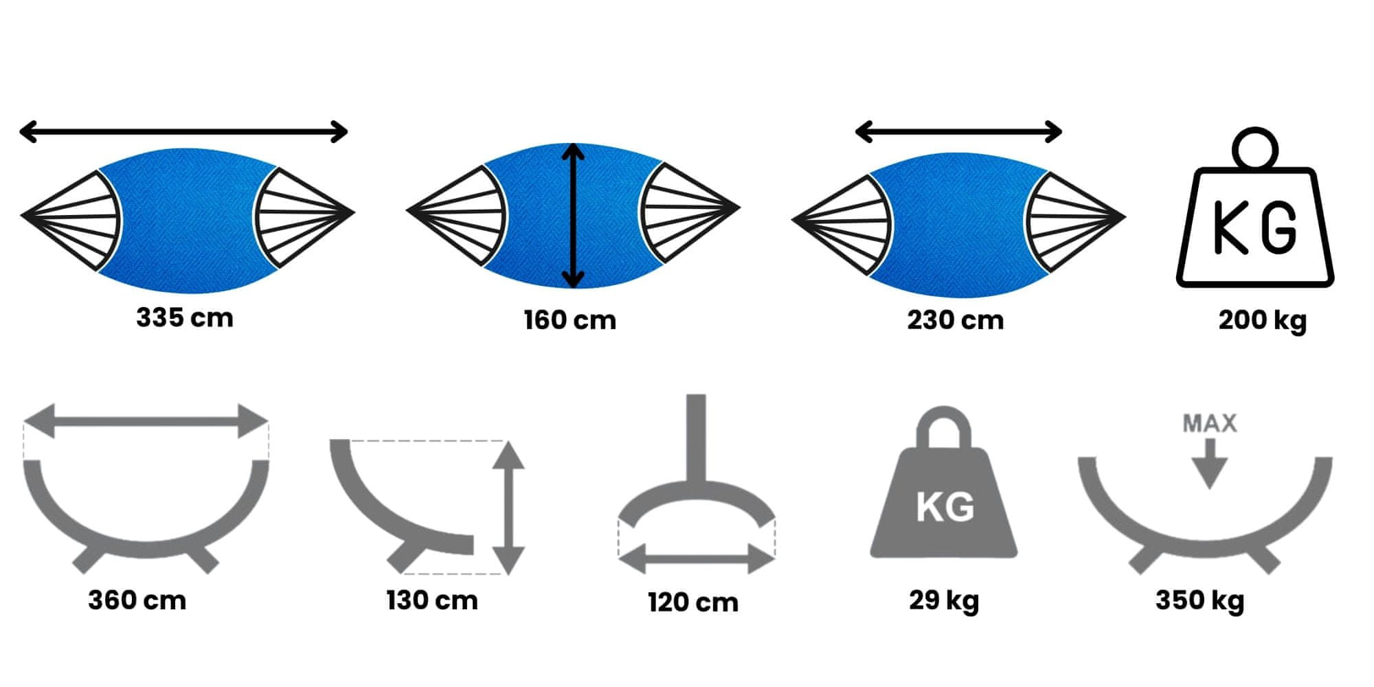Stojalo je primerno za viseče mreže, katerih skupna dolžina ne presega 350 cm. Idealno je za vse dvojne viseče mreže, tudi z delilniki, in za klasične viseče mreže. Okvir zlahka prenese obremenitve do 350 kg. Stojalo je izdelano iz jeklenega profila 60×40×2,2 mm.