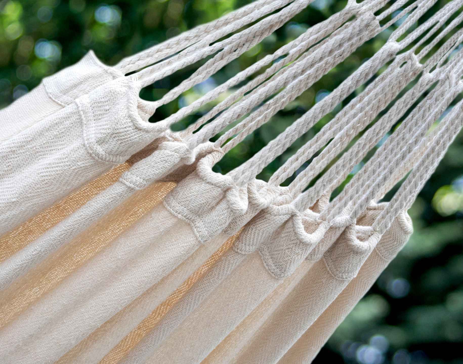 Material je izdelan po meri. Vsak rob je dodatno ojačan z uporabo tkanja z dvojno gostoto! Vse to zagotavlja, da so robovi viseče mreže estetski in izjemno močni.
