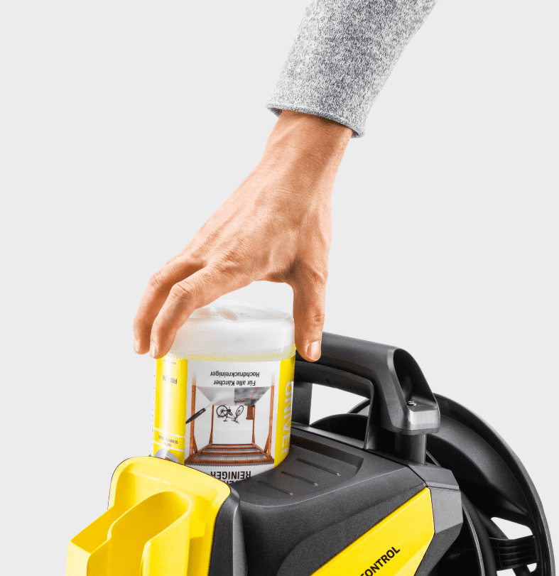 Paket vključuje tudi Plug ‚n‘ Clean sistem za preprosto menjavo detergenta, visokotlačno cev PremiumFlex za dodatno udobje, teleskopski ročaj za lažji transport, sistem Quick Connect, ki prihrani čas in trud pri vstavljanju in izstopanju visokotlačne cevi iz naprave, sprožilno pištolo in držala za vse dodatke. Preprosto rokovanje z napravo omogoča priročen kolut za cev.