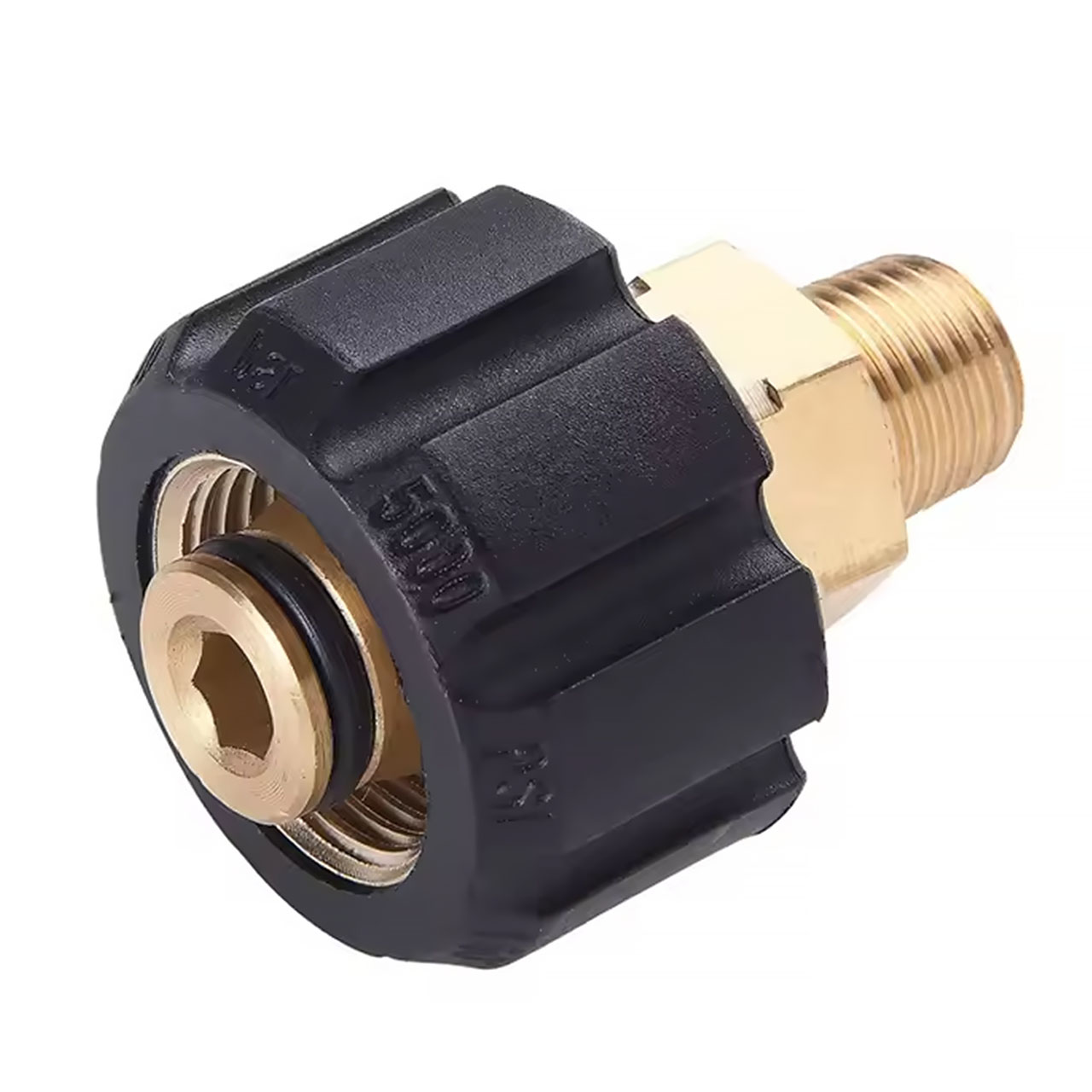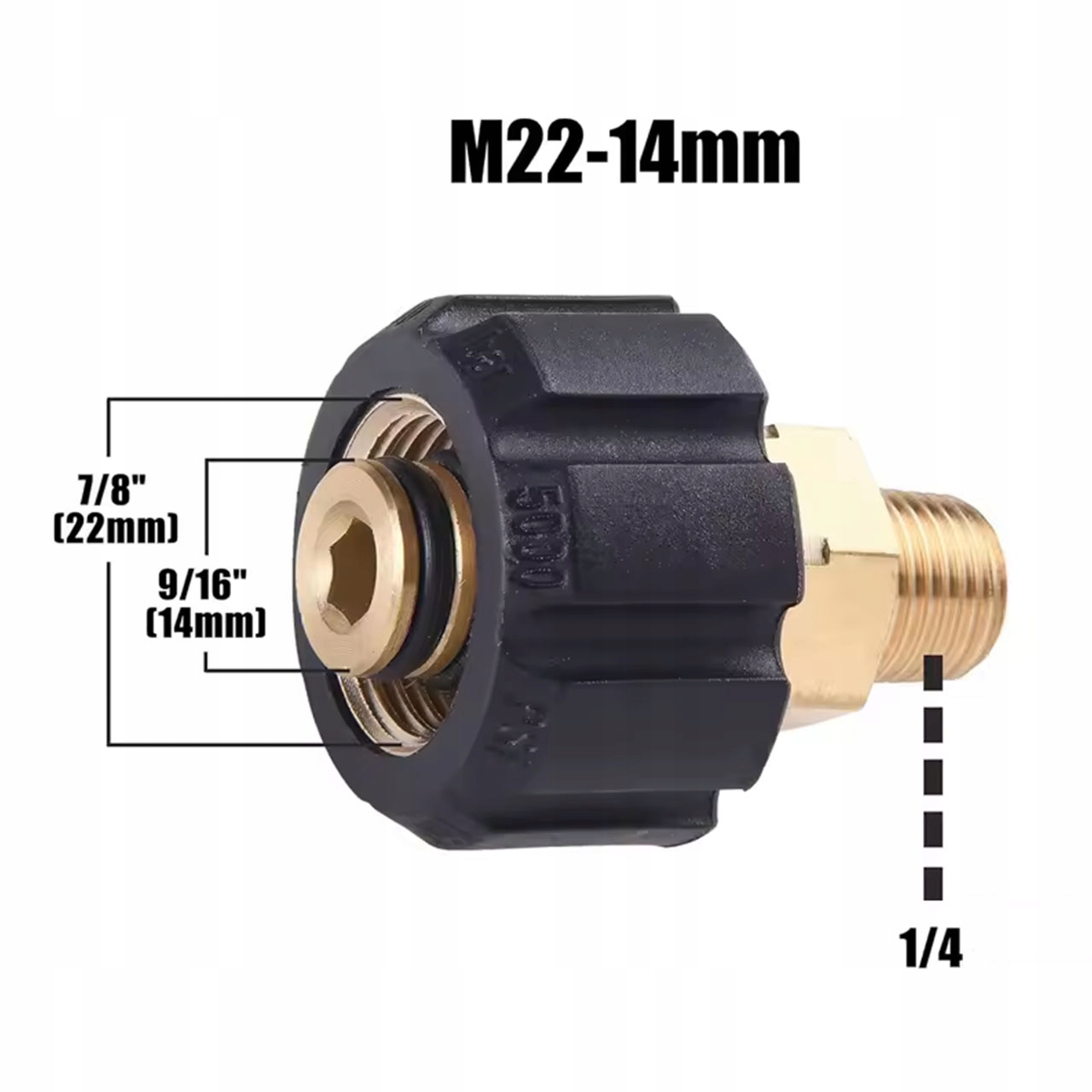 Adapter pozwala połączyć elementy z przyłączem M22–14 mm z osprzętem wymagającym gwintu 1/4" zewnętrznego. Precyzyjnie wykonane gwinty i mosiężny korpus zapewniają trwałość i pewne połączenie w pracy z myjką ciśnieniową.