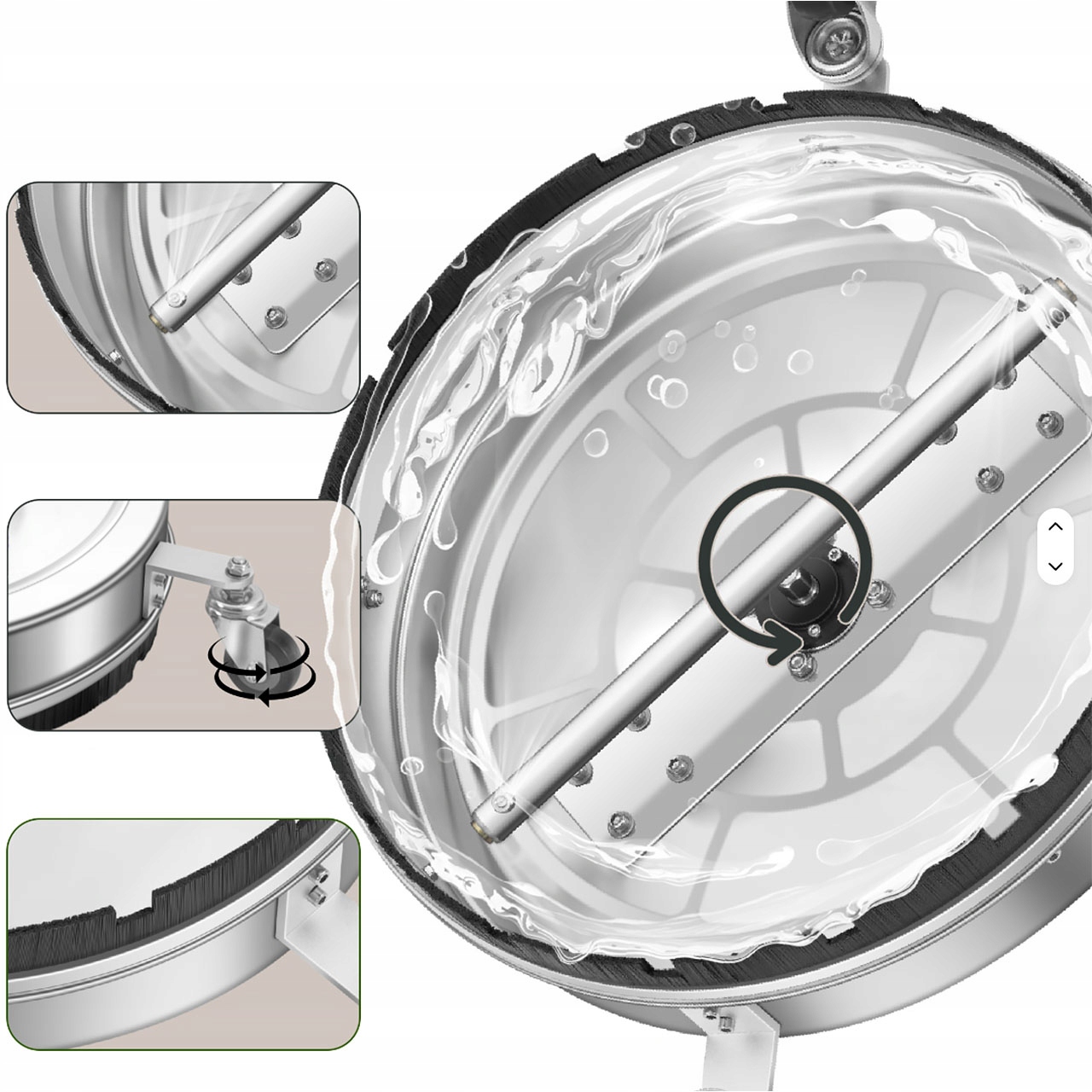 ✅ Obrotowe, elastyczne kółka 360°: Wirujące strumienie wody dla równomiernego i skutecznego czyszczenia bez smug. Koła ułatwiają przemieszczanie szczotki podczas pracy, zapewniając wygodę użytkowania