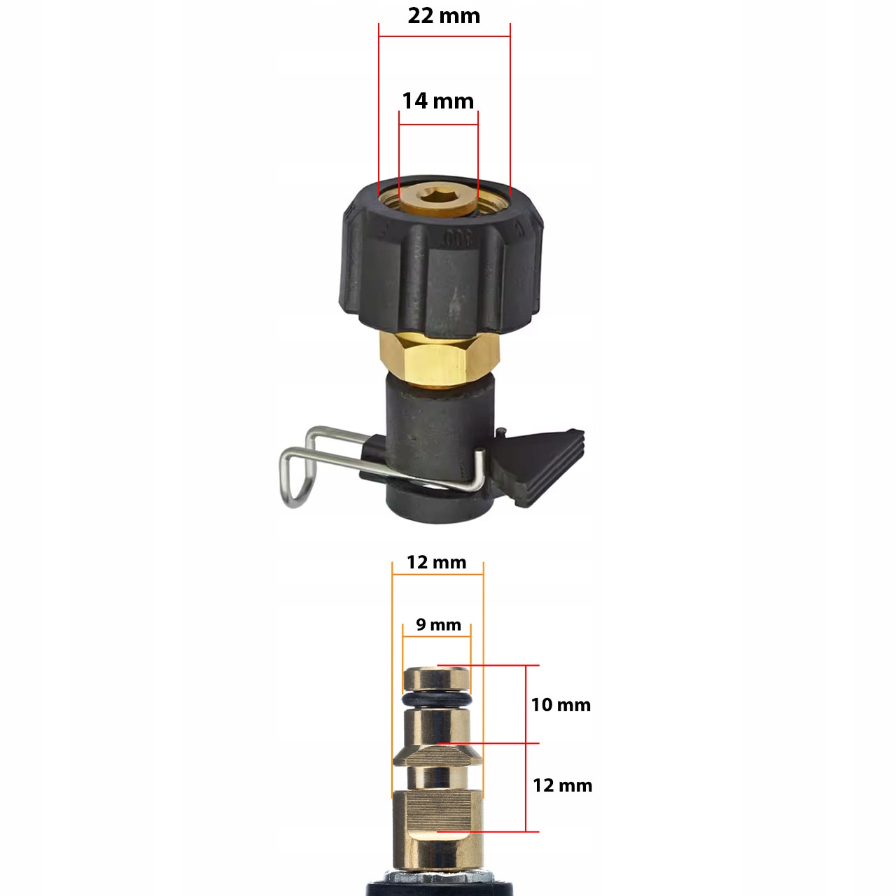 Z jednej strony znajduje się gwint M22 z trzpieniem 14 mm – standardowe przyłącze w wielu profesjonalnych urządzeniach, z drugiej złącze typu A (click) – kompatybilne z domowymi wężami serii Karcher K2–K7.