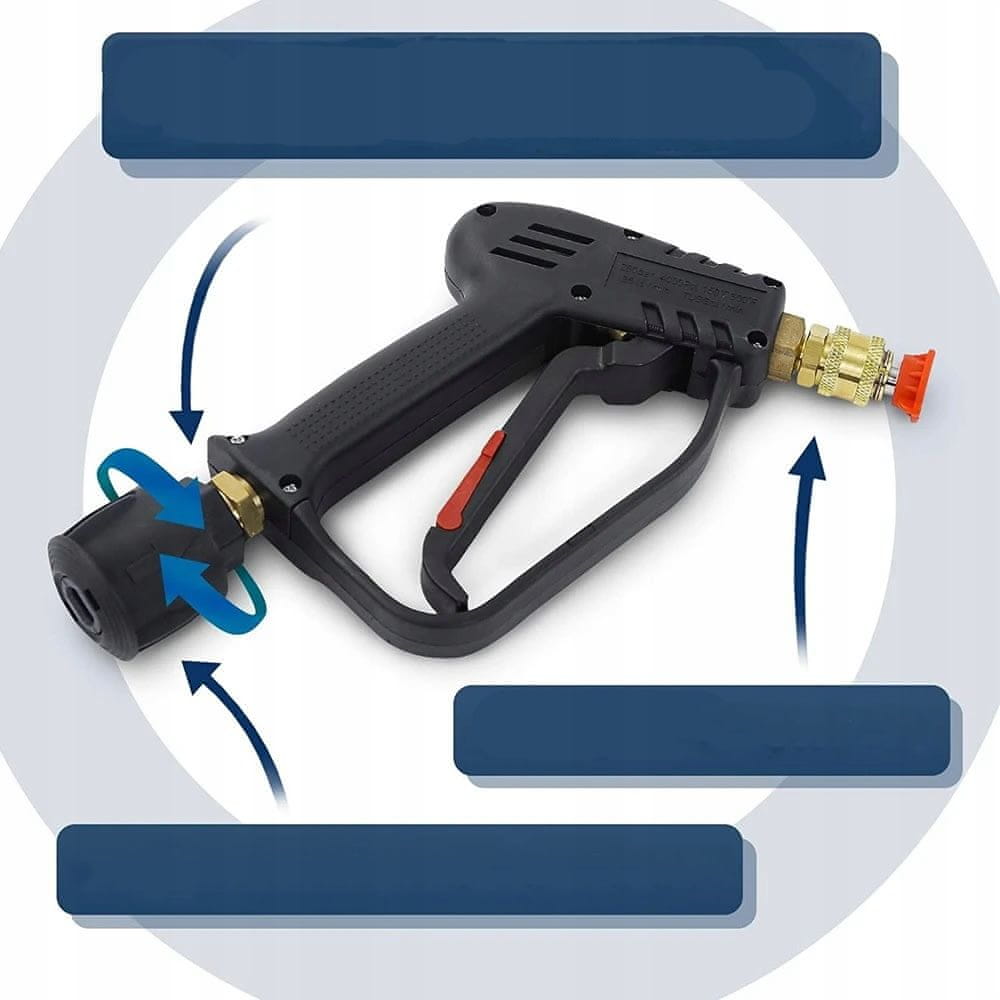 ✅ Hitra spojka: Pištola je opremljena s 1/4" izhodno hitro spojko in M22–14 navojno vhodno spojko (zunanji premer 22 mm, notranji premer 14 mm). To omogoča enostavno in varno priključitev na visokotlačni čistilnik. Poleg tega komplet vključuje adapter, na katerega lahko pritrdite cev z navojem.