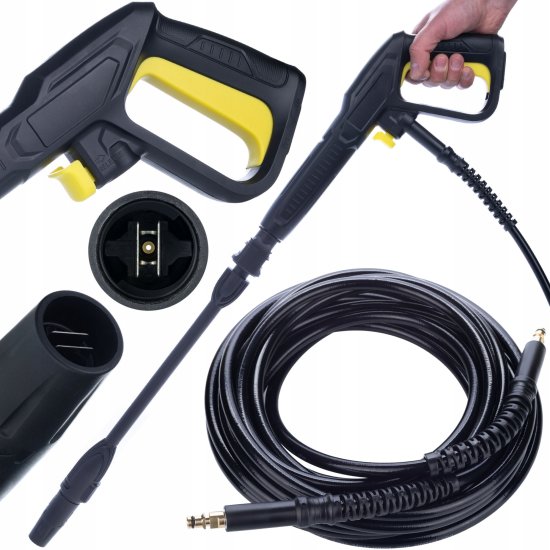 Pištola + komplet šob z nastavljivo šobo VARIO in 8 m visokotlačno cevjo za pralnike Karcher K2–K7 s sistemom Click / Click Connect. Omogoča popoln nadzor nad vodnim curkom in svobodo gibanja zahvaljujoč podaljšani cevi. Izdelan iz trpežnih materialov, odpornih proti intenzivni uporabi in visokemu tlaku.