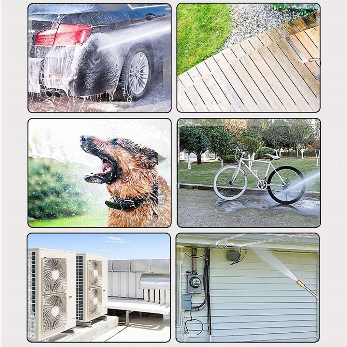 Čiščenje avtomobila:Visokotlačni čistilnik je odličen pripomoček za pranje vašega avtomobila. S karoserije, platišč, oken in drugih avtomobilskih delov lahko učinkovito odstranite umazanijo, vdelan prah, insekte in druge onesnaževalce.