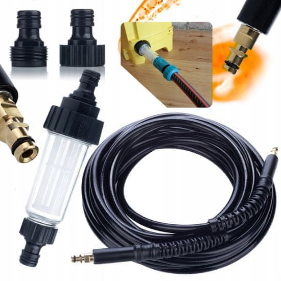 - 10 m visokotlačne cevi s sistemom Click-Click, ki zagotavlja prilagodljivost in udobje pri delu s visokotlačnimi čistilniki Kärcher.Univerzalni vodni filter