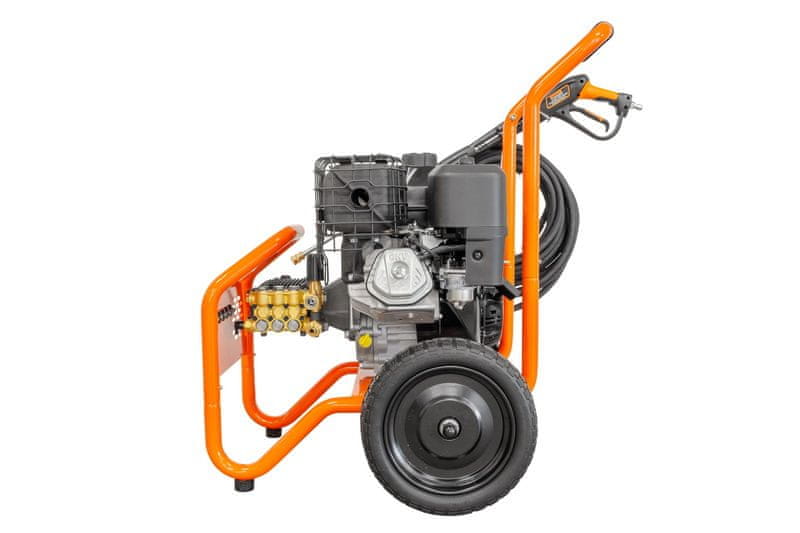 Kakovostna tlačna črpalka s pretokom 18 litrov na minuto, motor Briggs and Stratton s 13 konjskimi močmi z električnim zaganjalnikom, vodoodporen tahometer in indikator baterije zagotavljajo brezhibno delovanje. Zaradi visokega tlaka in širokega nabora dodatkov je ta stroj pravo orodje za vsakodnevno delo. Paket vsebuje komplet visokotlačnih šob, visokotlačno pištolo in 15 m gumijasto cev z veliko vzdržljivostjo.