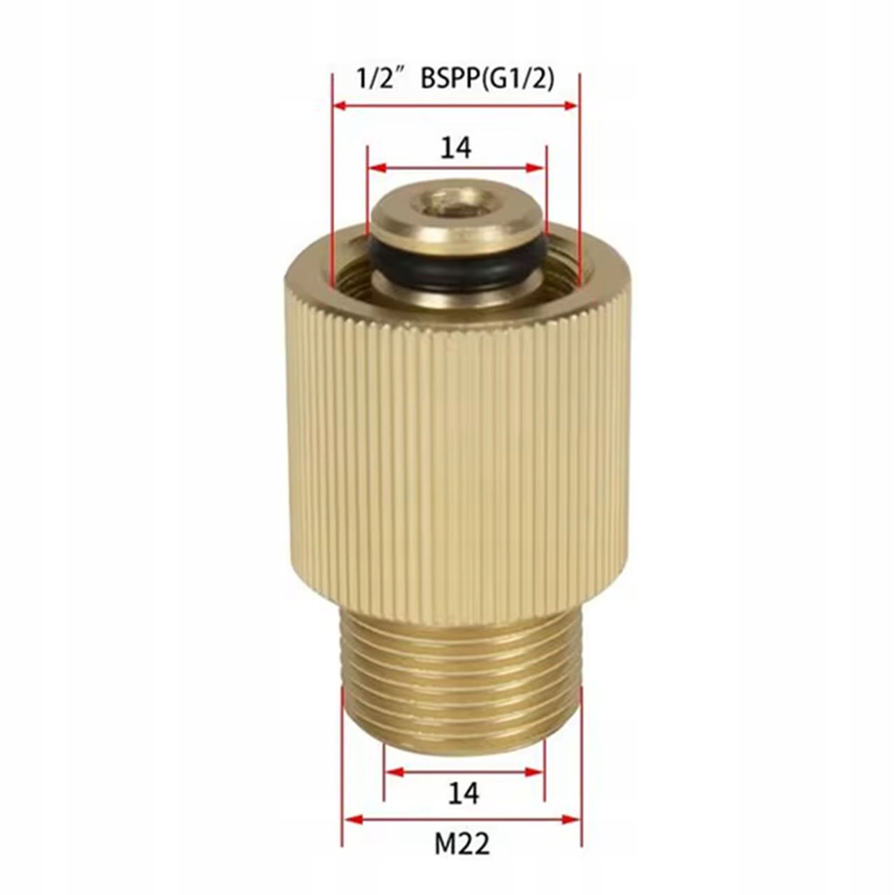 Gwint BSPP 1/2” (znany również jako G1/2”) to brytyjski standard gwintu rurowego, stosowany często w systemach pneumatycznych, hydraulicznych i ogrodowych. Dzięki temu adapter może być użyty np. do podłączenia pistoletu z gwintem G1/2 do węża z końcówką M22 i trzpieniem 14mm standard Karcher / Kranzle ).